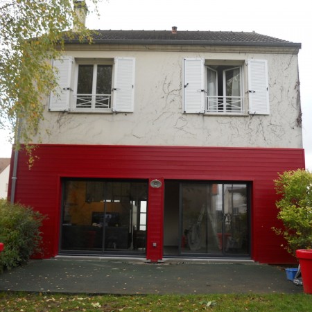 Projet : Remplacer les portes fenêtres par 2 grandes baies vitrées coulissantes en alu avec volets roulants électriques. Création des agrandissements sur mur porteur et modification des installations électriques. Habillage de la façade et des tableaux en bardage bois. Un vrai gain de lumière et un sentiment de grands espaces.