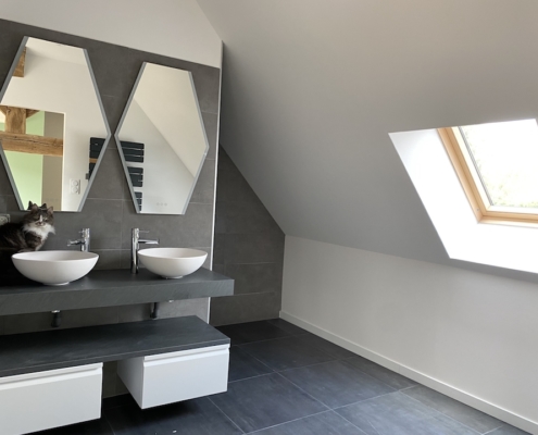 Après près de 6 mois de travaux, les combles desservent maintenant 1 suite parentale, 1 chambre, 1 SDB ainsi qu’un toilette et une mezzanine. Nous avons installé une PAC (pompe à chaleur) air/air pour un confort en hiver comme en été.